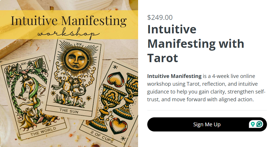 By the end of Intuitive Manifesting, you’ll have a clearer understanding of where your manifestation process has been flowing naturally and where it may have felt blocked. You’ll walk away with practical Tarot spreads you can use for self-reflection, stronger self-trust, and a deeper sense of emotional alignment.